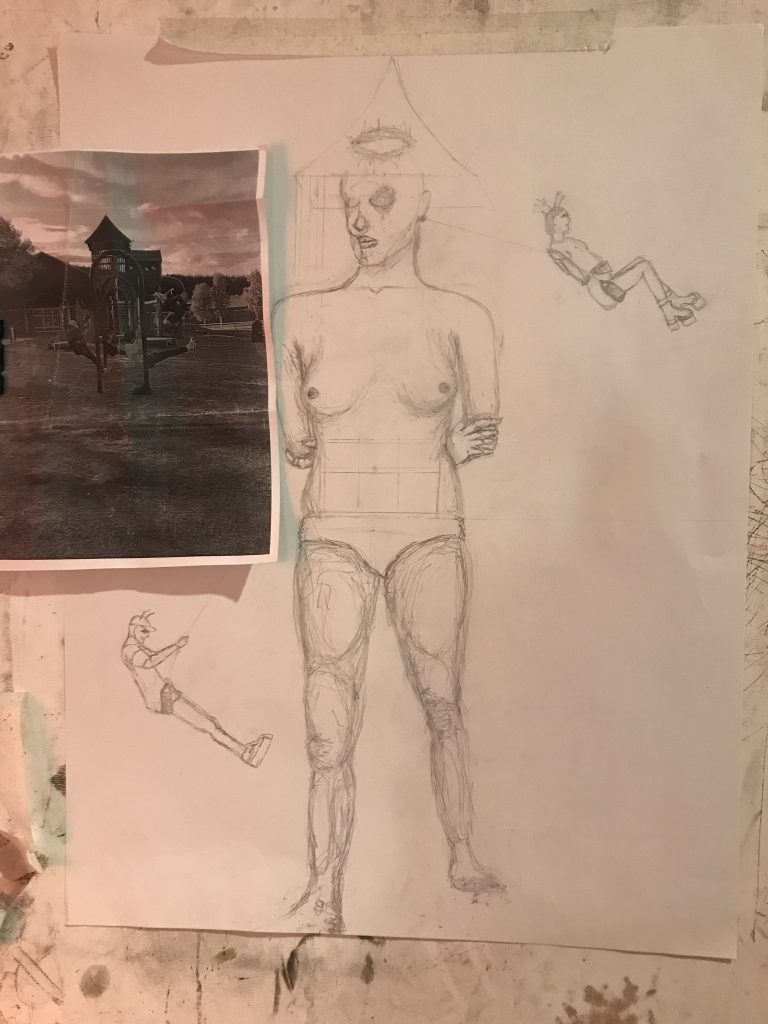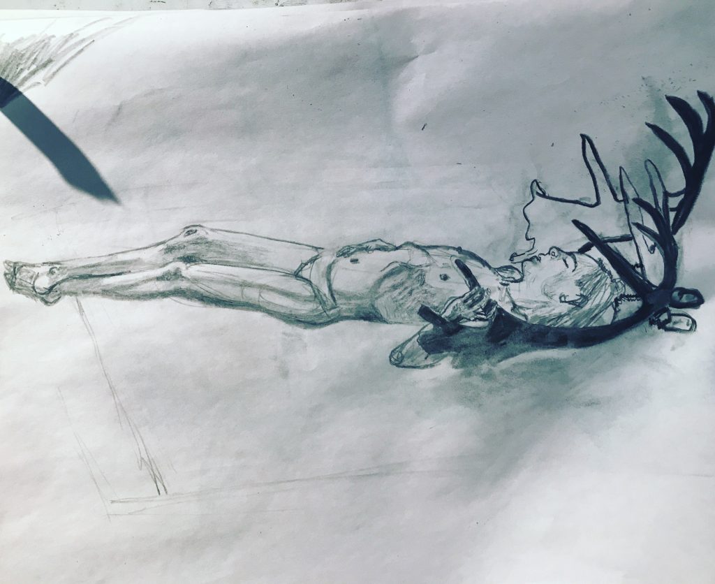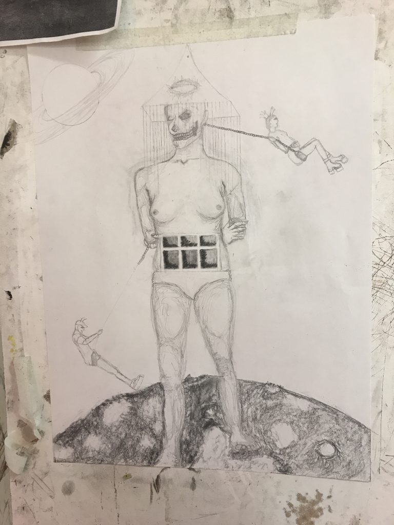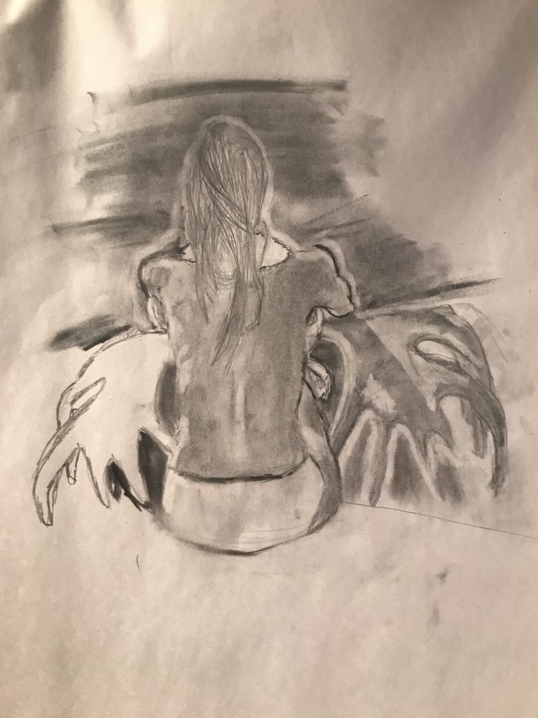 For this piece the instructor asked us to mesh together a pose from life drawing we had done and elements from a photograph.