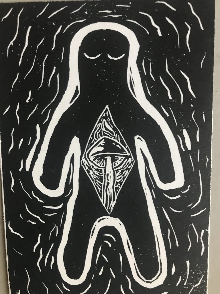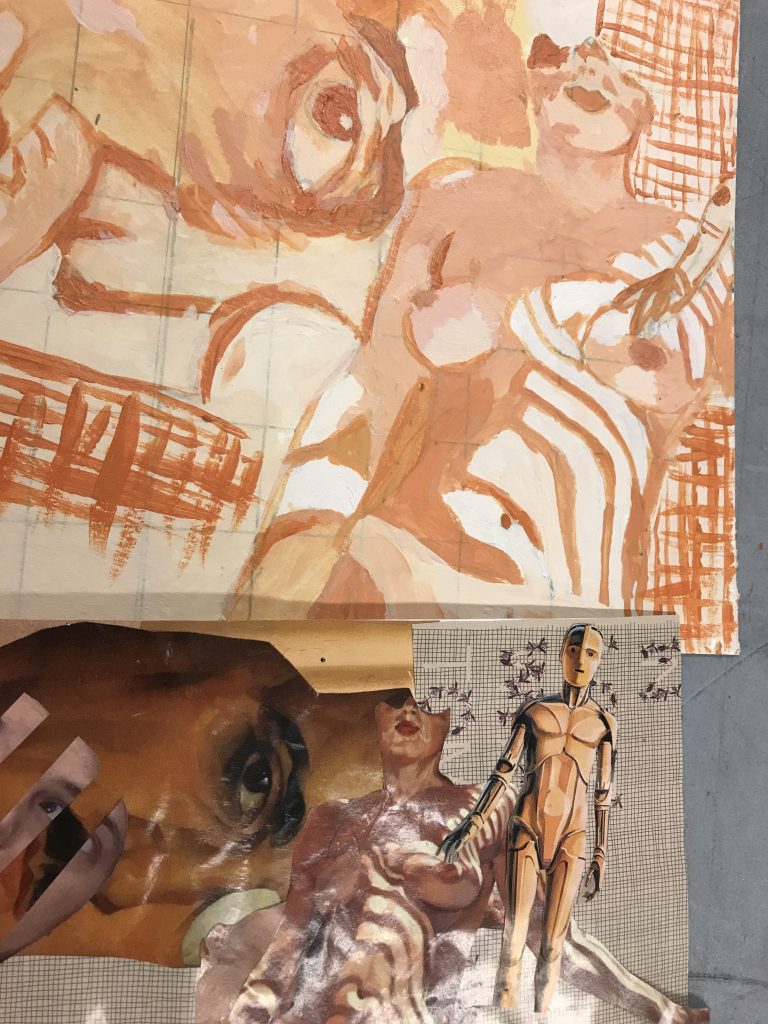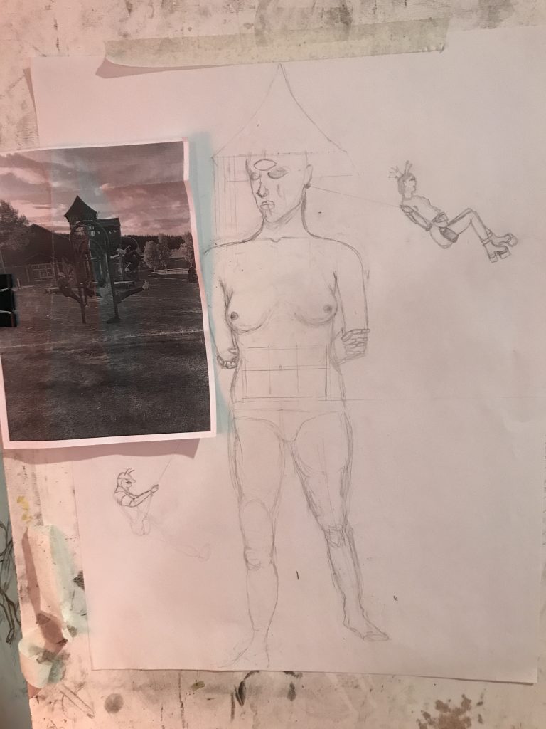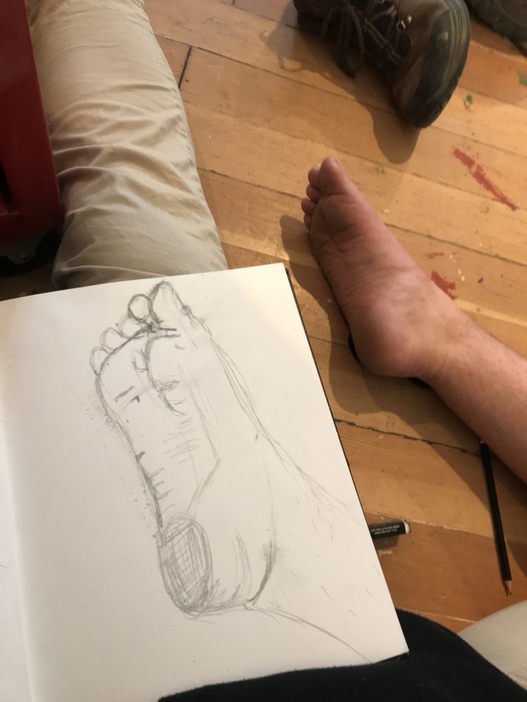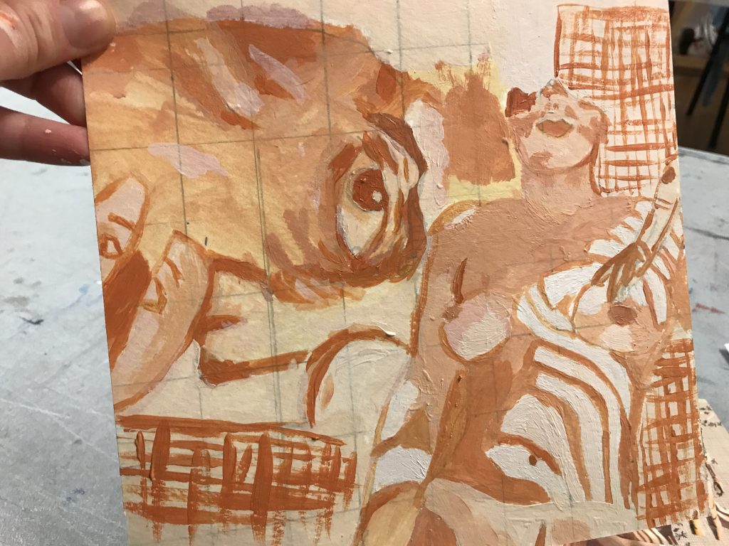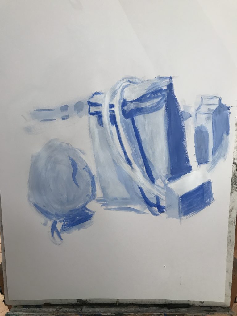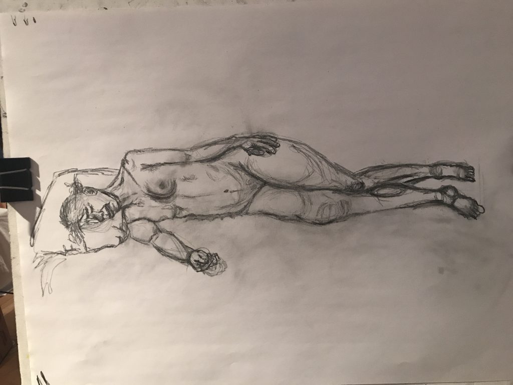 I struggled with painting. Recently, the only painting I had done was to recreate images off the internet for themed parties, I had no experience in proper colour usage, value, or shading. I had to battle a lot of internal negative self talk about not being good. Our guest instructor, local painter, Claire Falkenberg was very encouraging, and always reinforced the value of all the work that was being created by our class. She taught us how to look and focus on one tiny section of a piece, and try and find “the thing”.. find what was working and build from there.